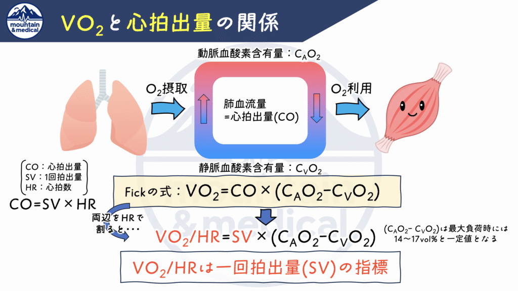 CPXでは 酸素脈(O₂ Pulse = VO₂/HR)という指標を使って、運動中の1回拍出量を推定します。