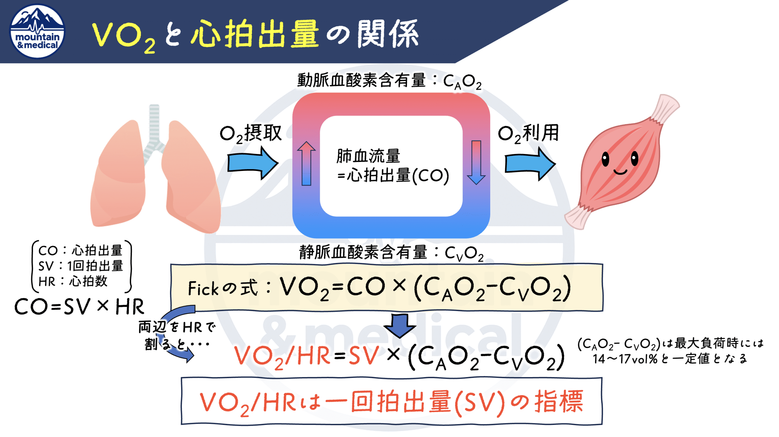 CPXでは 酸素脈(O₂ Pulse = VO₂/HR)という指標を使って、運動中の1回拍出量を推定します。