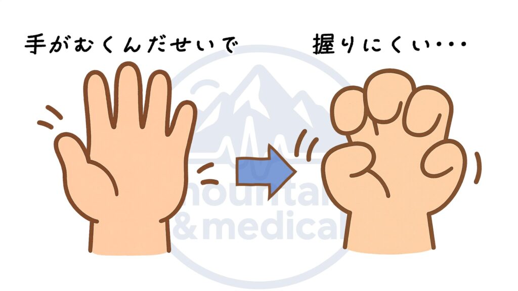 この現象をPOTASHポターシュ(Post-ambulatory swollen hands)と呼びますが、POTASHポターシュは特に下山で起こりやすいです。