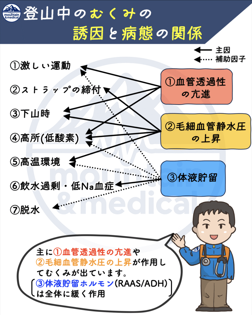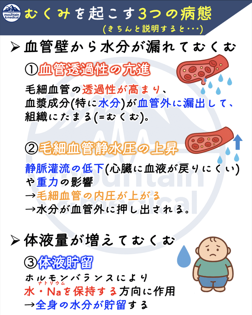 上記のように高所でむくむ理由は主に血管側の問題①②であり、体液貯留③は主因ではありません