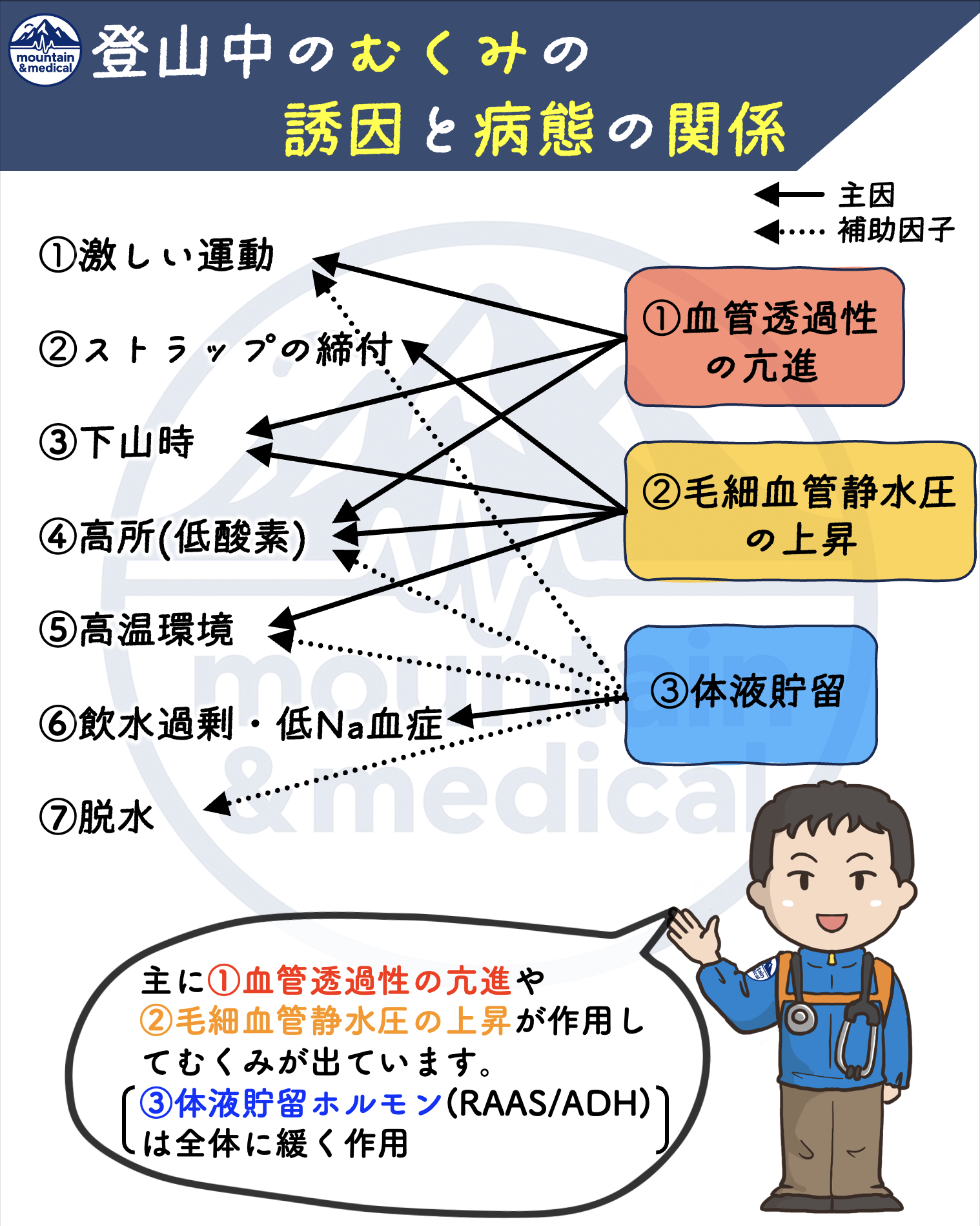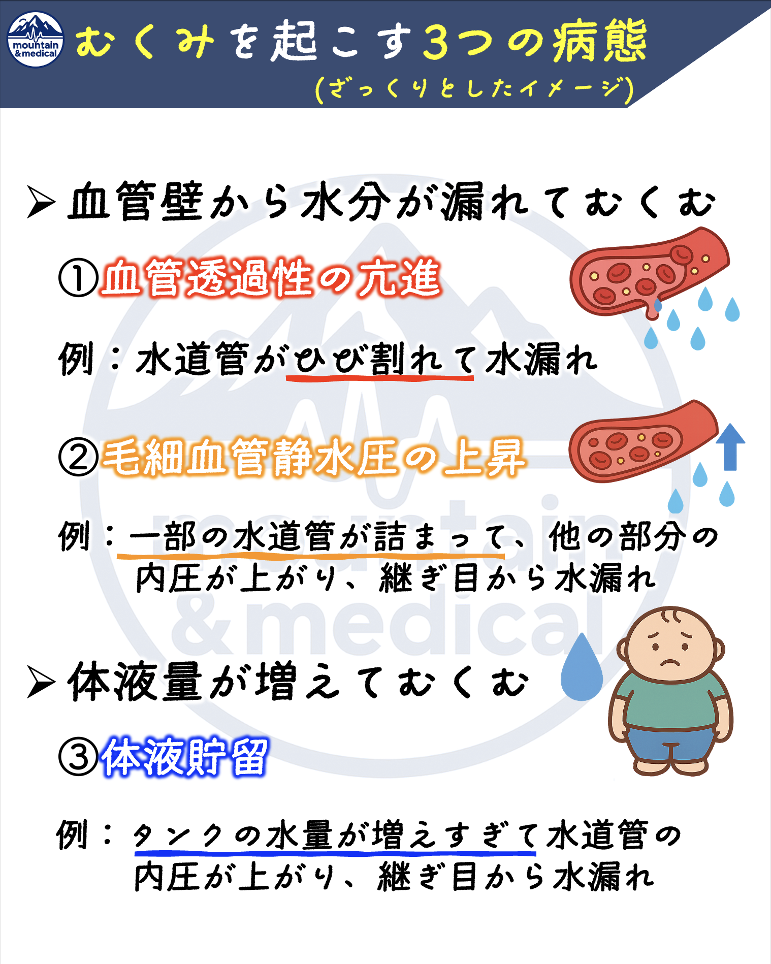 上記のように高所でむくむ理由は主に血管側の問題①②であり、体液貯留③は主因ではありません