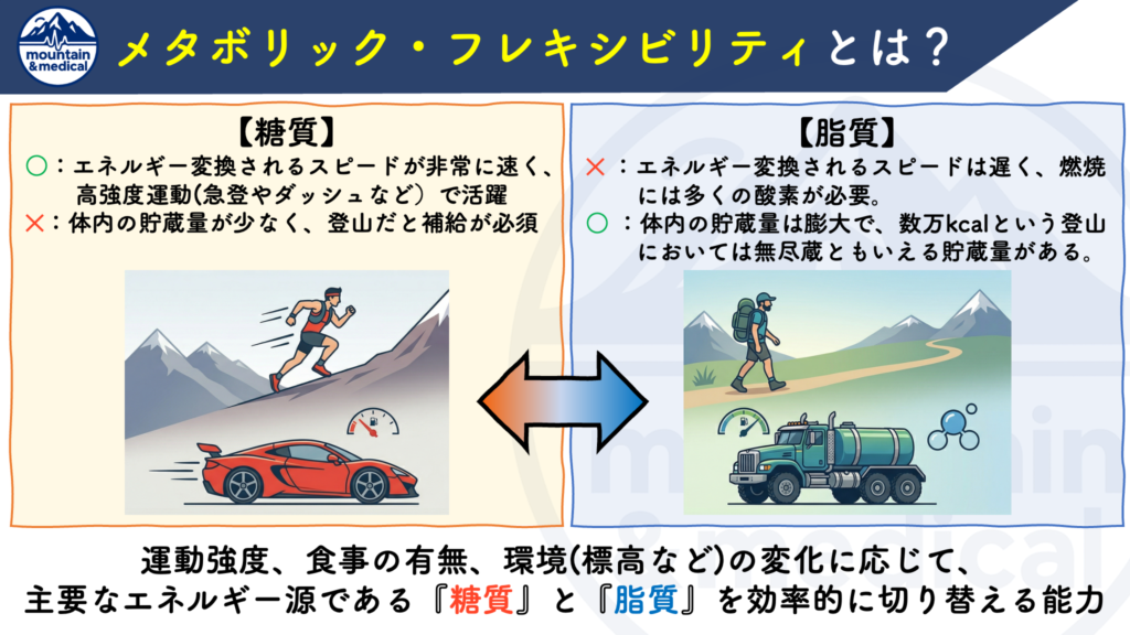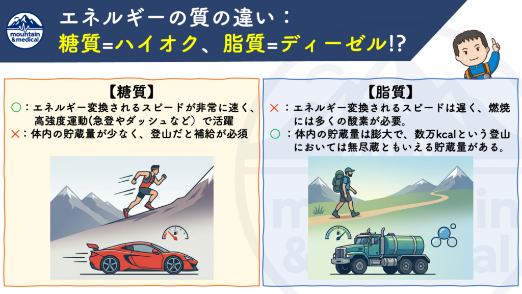 「平坦な道や緩やかな登り(低〜中強度)では無尽蔵の『脂肪』をメインエンジンとして使い、急登や高所、いざという時には『糖質』のサブエンジンもスムーズに回せる状態」が理想ですよね。