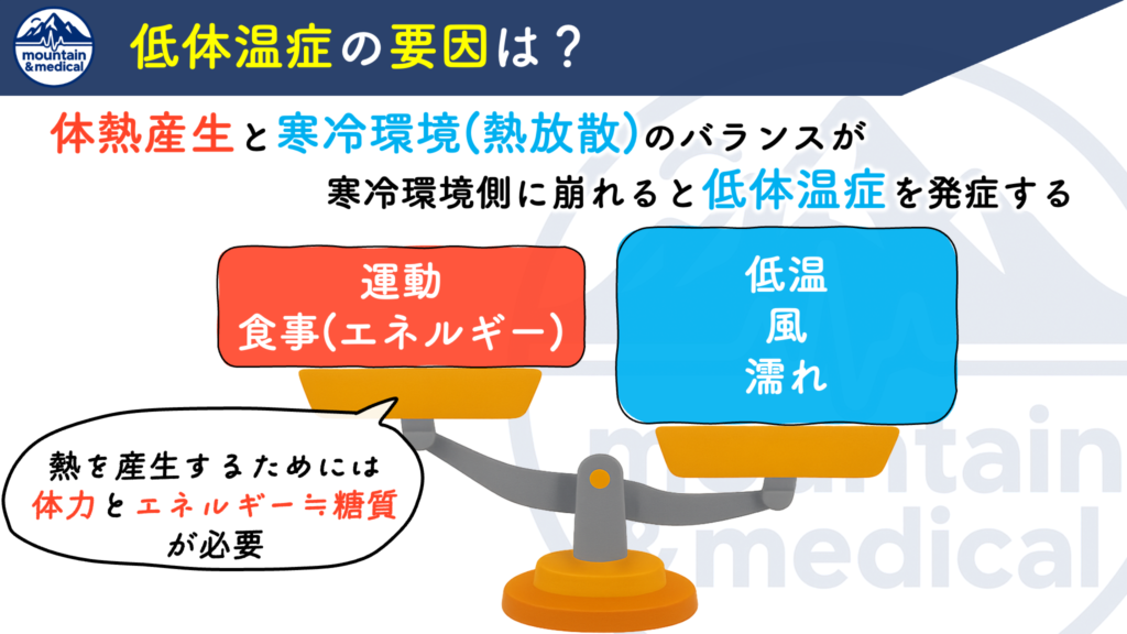 低体温症は“体温産生”と”寒冷環境による熱放散”のバランスが崩れたときに発生します。