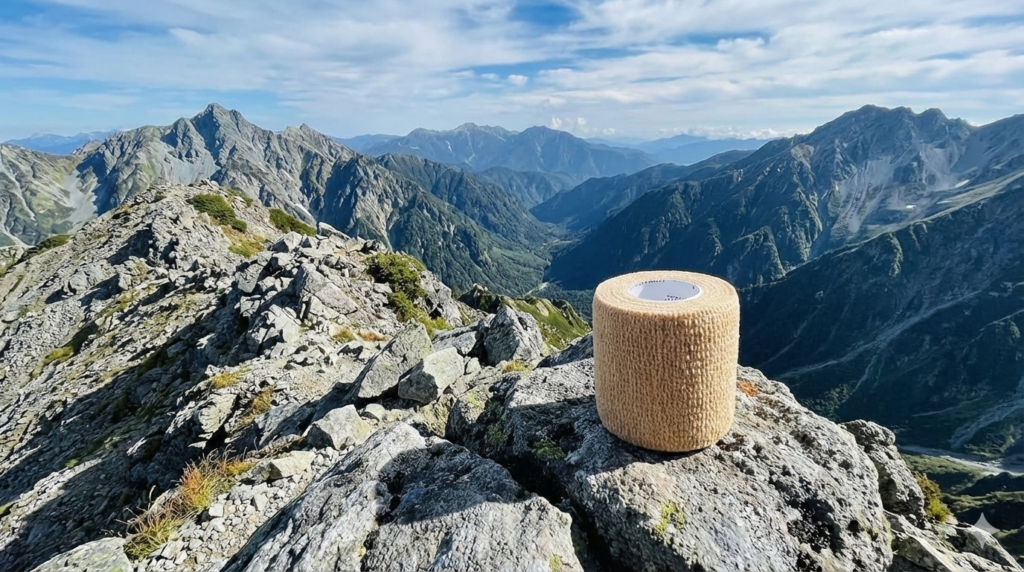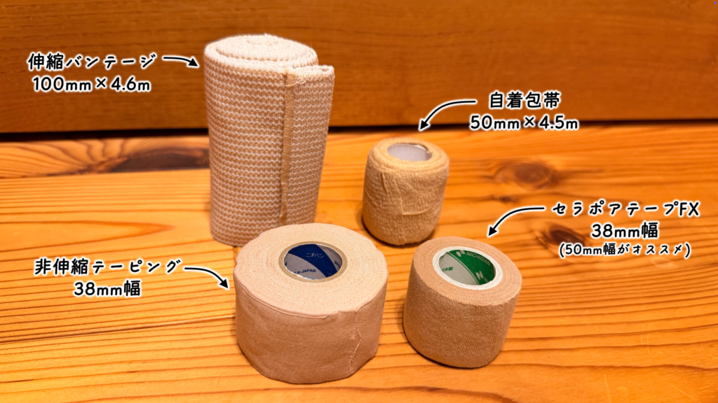 • 登山ではテーピング後も行動するため腫れによる血流障害を防ぐためにも非伸縮に加えて自着包帯での固定が有用