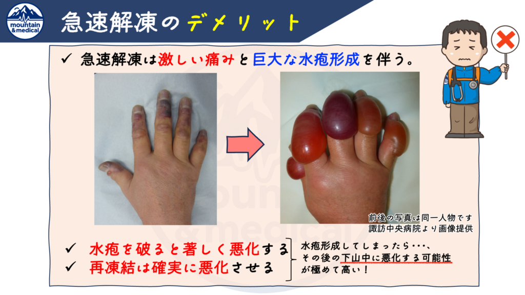 しかし、現実的には、ある程度の環境・設備が整った山小屋内であってもまだ山中から抜け出せていない状況で、急速解凍をすべきではありません。