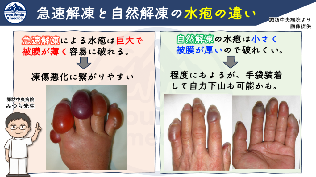 - 急速解凍を行うと、激しい痛みと破れやすい巨大水疱ができる