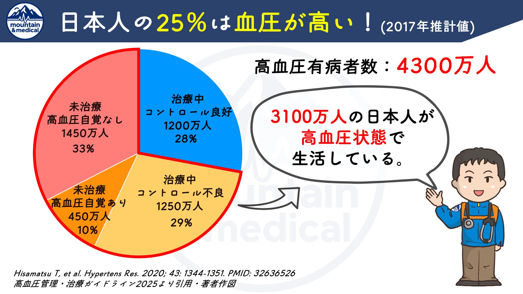 従って、成人〜中高年以上がメインの年齢層である登山者における高血圧患者の割合はもっと多いと想定されます。