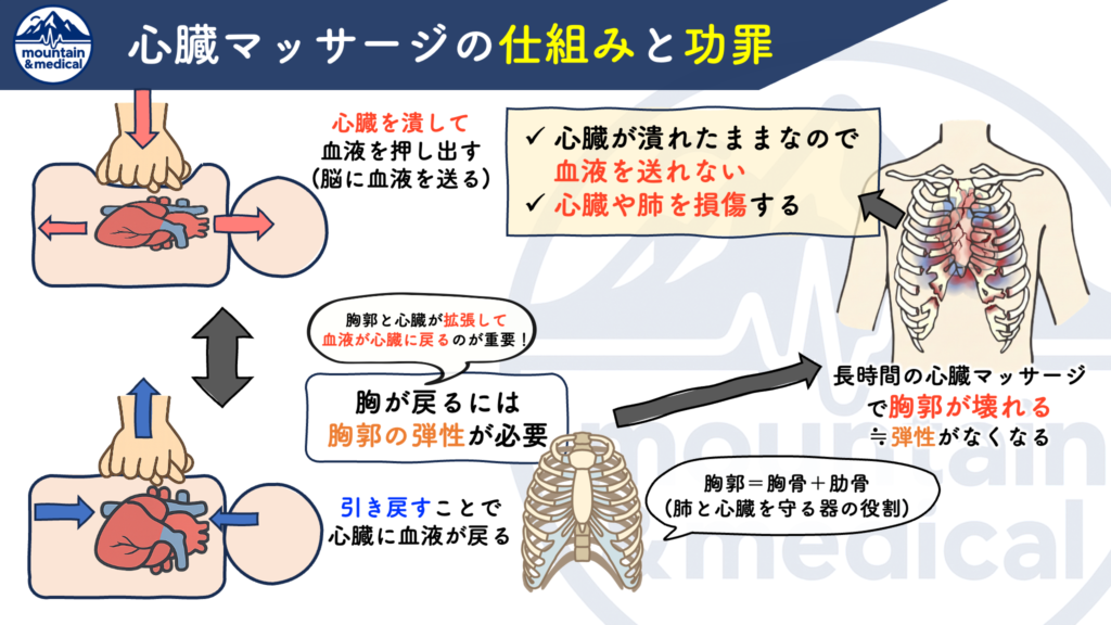 「心臓マッサージは長時間行えば胸郭(肋骨+胸骨)に大きなダメージを与えます」
