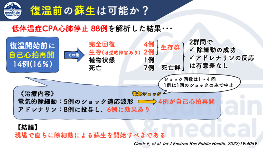であることを考えると、低体温症は2倍以上の生存率であり、生存率が高いことは事実です。
