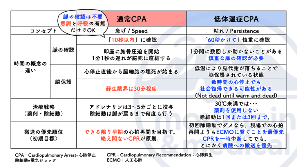 通常の心停止が「時間との戦い」であるのに対し、低体温症の心停止は「生理学的な持久戦」です。
