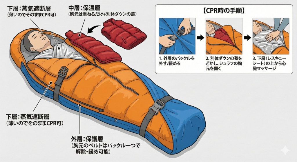 山中や山小屋などでは心肺停止状態のままで復温(保温・加温)しようと思っても効果はかなり限局的です。