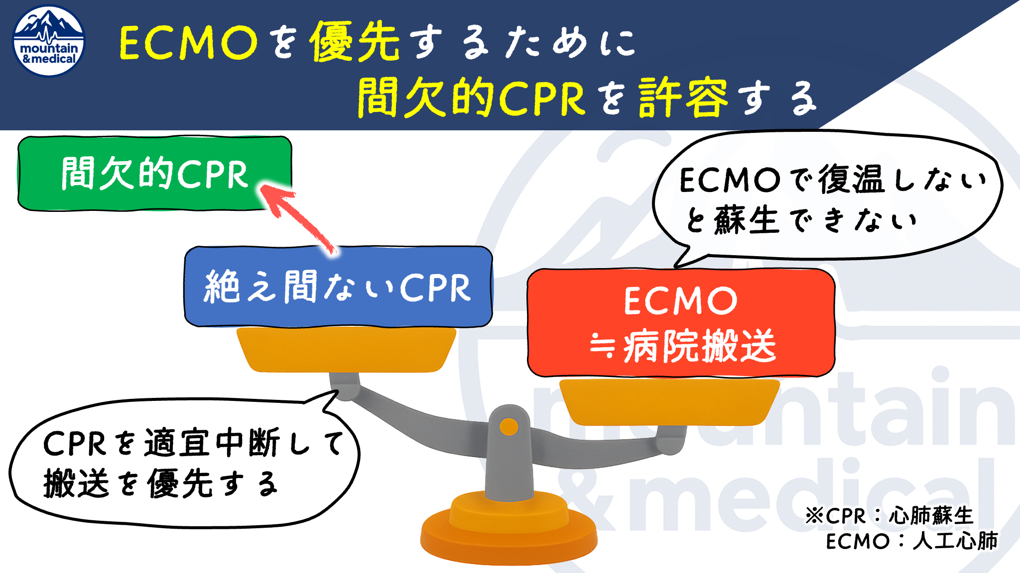 低体温症CPAでは、その場で蘇生できる可能性はかなり低いです。