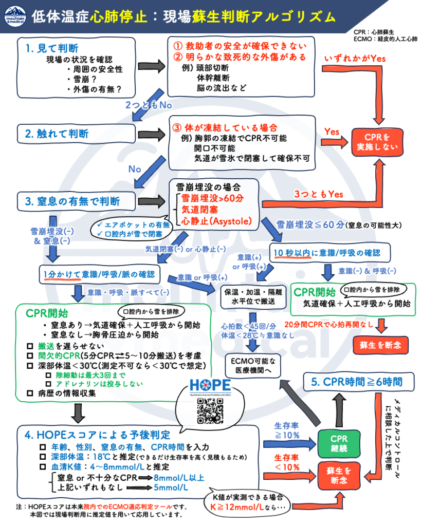 これらのガイドライン、勧告のなかで低体温症心肺停止に対する判断・処置として推奨されている事項をまとめて、現場で使えるアルゴリズムを独自に作成しました👇