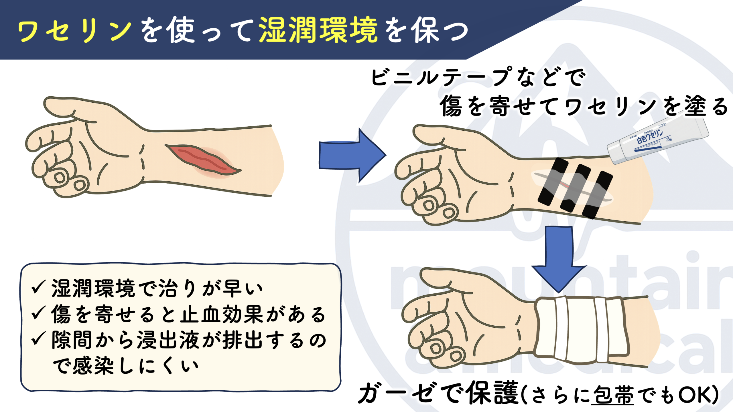 したがって、乾燥させてしまうと、傷の治癒が遅延します。